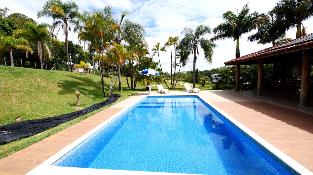 🚩Paga tu viaje en hasta 6 cuotas SIN INTERESES Casa de Campo ILUMINADA, espaciosa y cómoda CONDOMINIO CERRADO con vigilancia las 24 horas. 5 DORMITORIOS, 1 en suite con agua 5 BAÑOS + BAÑOS Zona con barbacoa, horno de pizza, estufa de leña y cervecería Habitación con CHIMENEA Dejamos el FUEGO encendido. PISCINA (10 m x 4 m, sin calefacción) Gramado c/ GOLZINHO INTERNET de fibra óptica (400 MB) TIENDAS cercanas Condominio con tienda de comestibles de AUTOSERVICIO ACCESO por carretera pavimentada SE ADMITEN MASCOTAS (casa vallada)