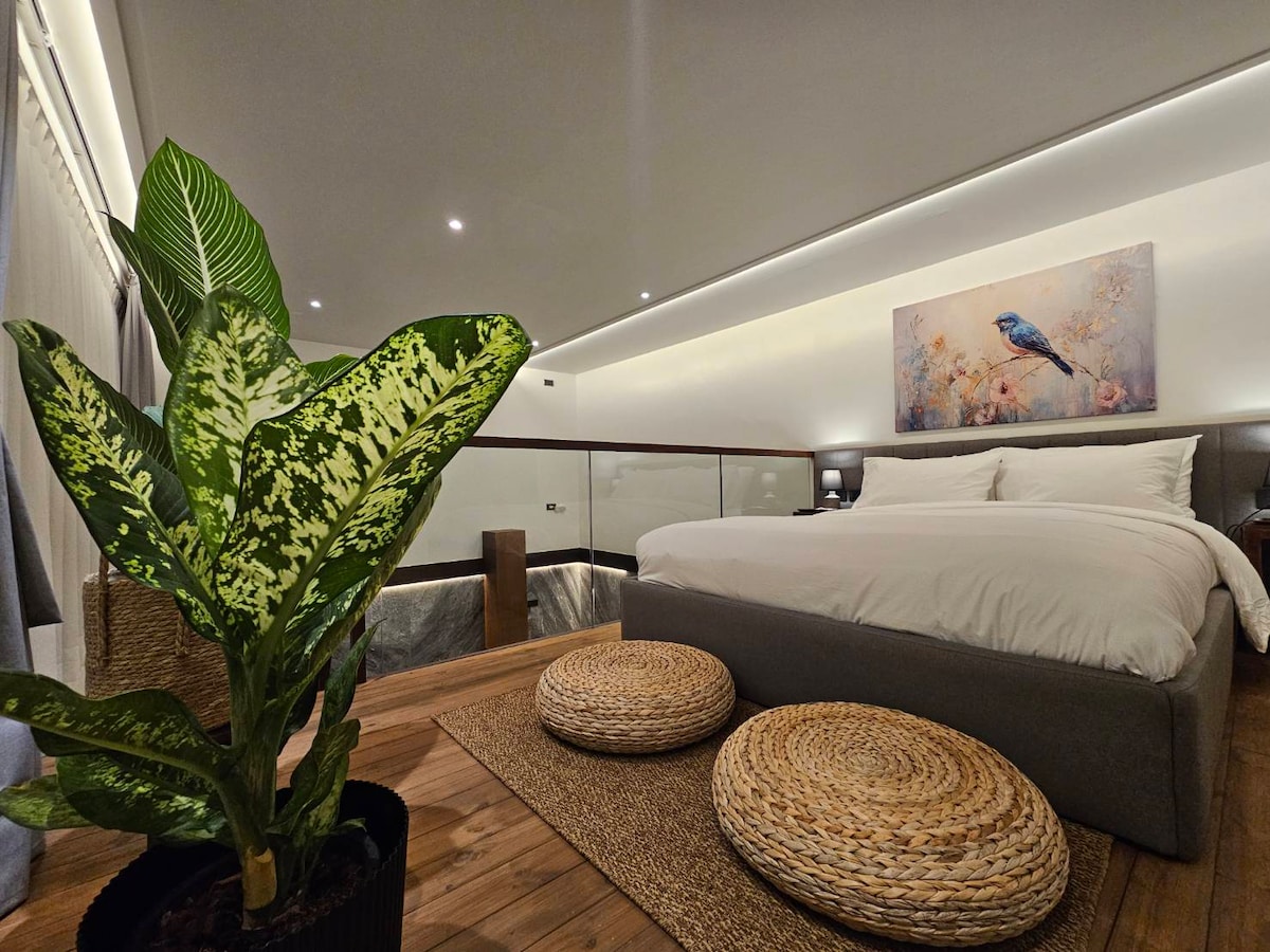Escape the noise and breathe. Our rooftop retreat offers two tranquil bedrooms, a comfortable living room, and a private jacuzzi under an open sky. Shaded by lush greenery with gentle breezes and sweeping views — located in Sukhumvit, minutes from Bangkok's top shopping malls. Perfect for couples, families, or a group of friends seeking comfort and calm.