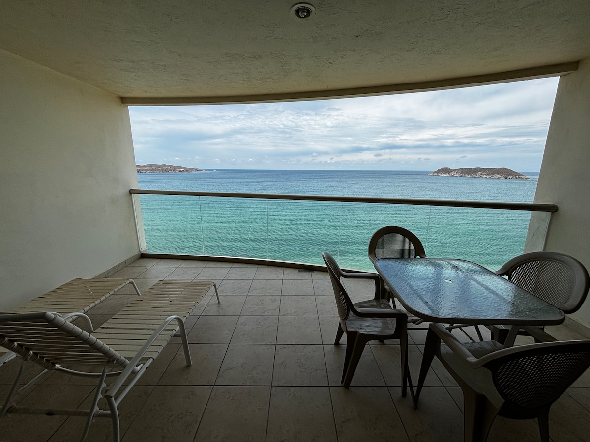 Bonito Condominio frente al mar, totalmente equipado. Situado en el segundo piso, cuenta con espléndida vista al mar que se aprecia desde una amplia terraza. Con vista también a las principales amenidades del lugar; cuenta con cocina equipada, agua caliente, aire acondicionado, TV, internet. Las amenidades incluyen playa, alberca, jacuzzi, elevador y gimnasio. Perfecto para parejas, familias con hijos pequeños y para personas que viajan solas. Estacionamiento privado y vigilancia 24 horas.