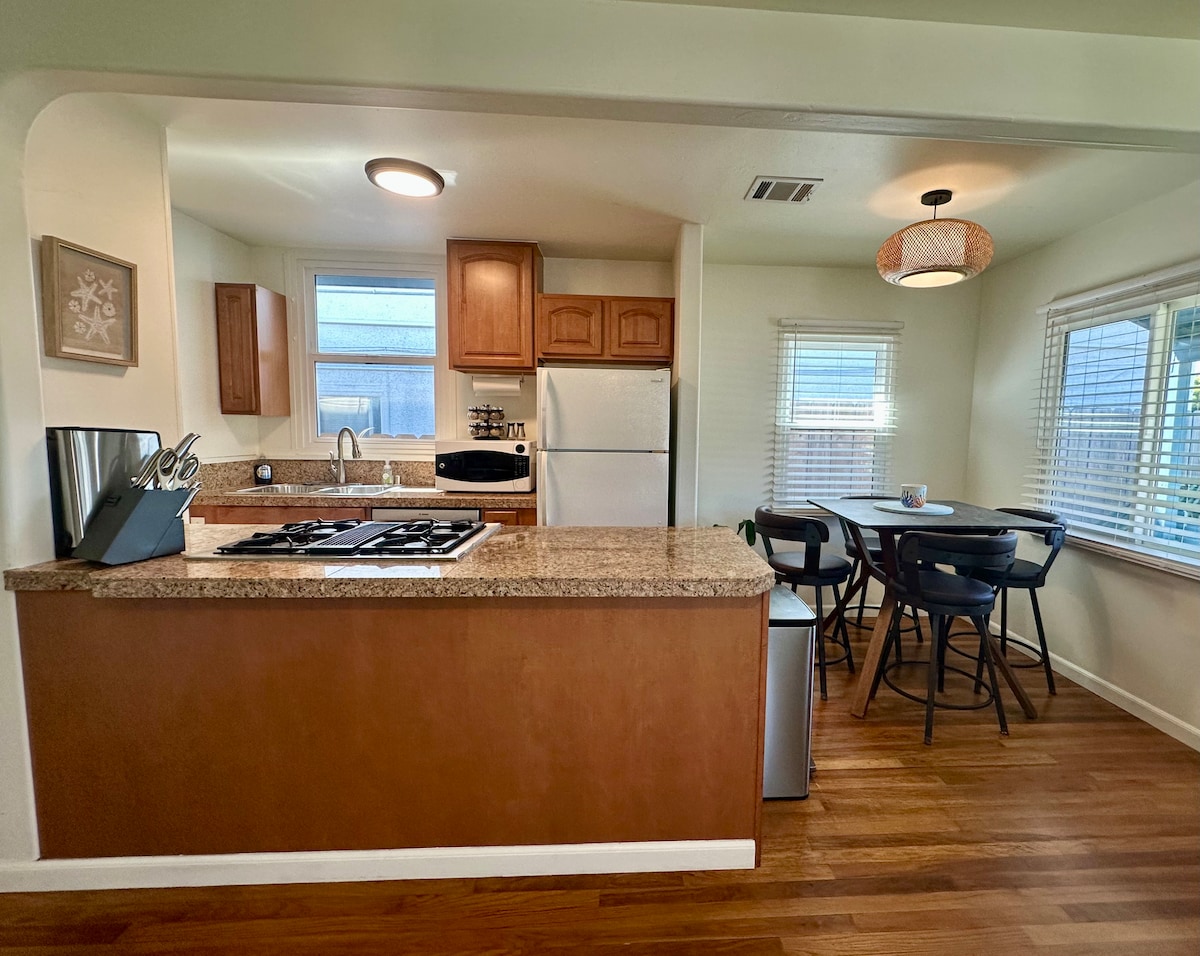 Una encantadora casa de campo en la playa del Pacífico. Recientemente renovado con comodidades de alta gama, patio trasero y delantero cuidadosamente ajardinado, amplia terraza, chimenea y parrilla. Todas las habitaciones tienen el modelo de aire acondicionado mini split más nuevo, puedes ajustar la temperatura deseada. Se encuentra a menos de 5 minutos a pie de la playa y a 2 minutos de Garnet Ave y Mission Blvd, con muchos bares, restaurantes y vida nocturna. Todavía está en una zona residencial, lejos del ruido.