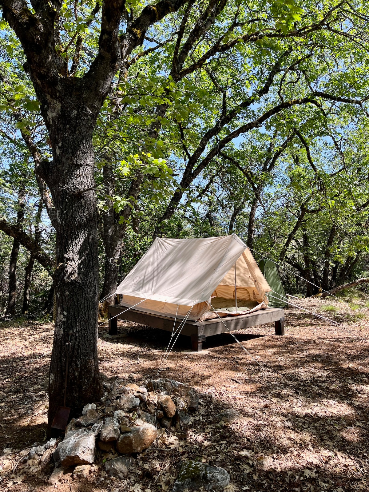 No trash service! Pack out your trash! No campfire, drug/marijuana, loud noise allowed, quiet hour 10p Large 200sf tent in the prime location, very close to the shared bathroom (hot water) Max 4 person (2 queen beds), 1 car No shoes allowed inside tent Picnic table No electricity in tent No lock You can rent heater and propane tank Sink in utility shed with drinking water 45 acre forest, hiking trails, creeks, waterfall, deer, turkey, owl 20 min to Los Gatos downtown, 25 min to Santa Cruz