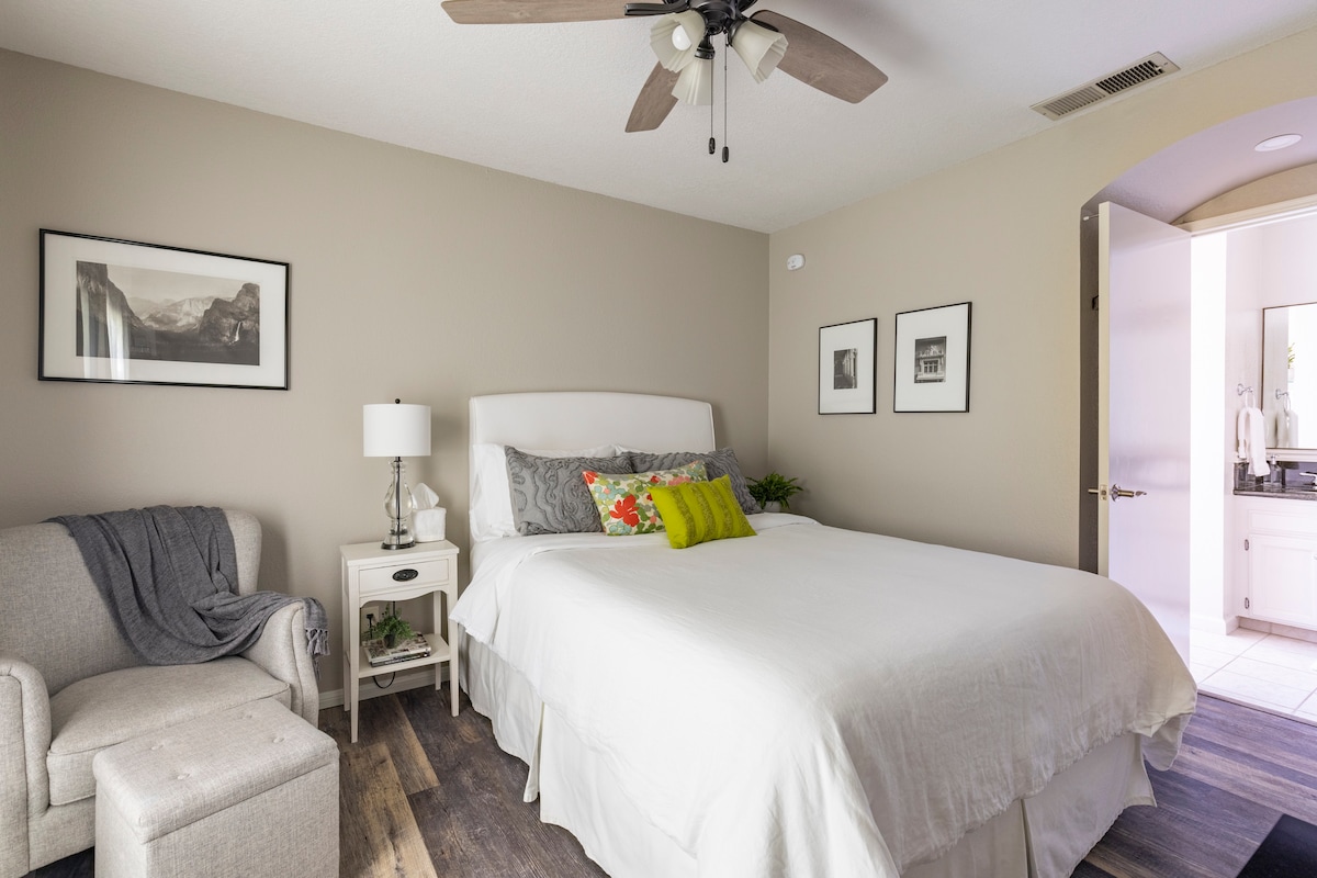 Descansa y rejuvenece en esta cálida y acogedora suite. Entrada privada, registro de entrada y baño sin llave. Nuevo marco de cama tamaño queen estilo francés Bastille, almohadas de plumas y sábanas de lujo de primer cajón. Mininevera, microondas, cafetera Nespresso y prensa francesa con café, té, crema, azúcar, tostadora, aperitivos, platos, cubiertos. Mesa de comedor para computadora portátil con 2 sillas y silla de noche, HVAC central, TV de pantalla plana de 43 pulgadas con cable, WIFI superrápido. Patio con sillas. Bandeja de DESAYUNO entregada a la suite de invitados una mañana durante tu estadía.