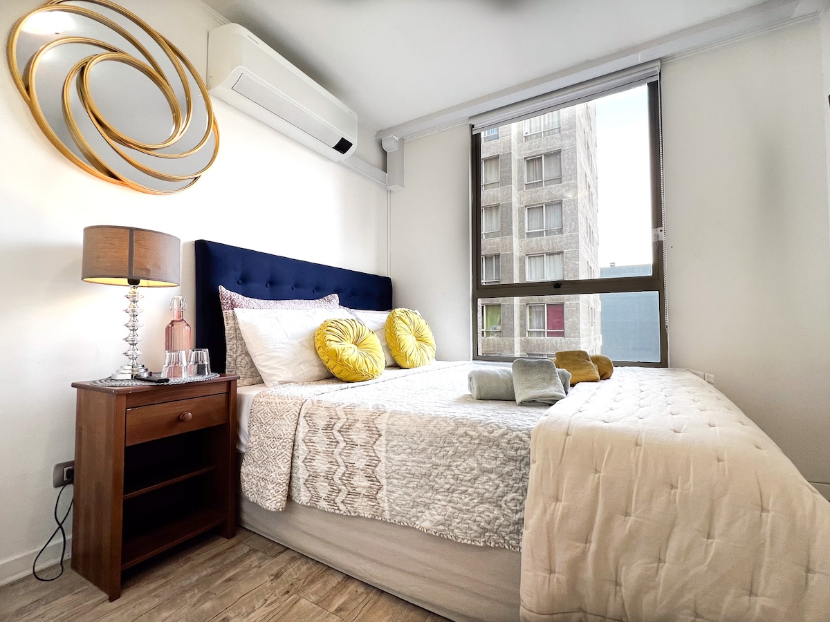 Unidad practica pară estadia de trabajo o placer a demás de ser un lugar muy proximo a muchos centros de eventos , comprende de 2 espacios , un dormitorio con una cama queen en una habitación privada y adjunto su living area donde hay un sofa cama tamaño queen , un baño privado con ducha y un semi kitchenette donde esta un frigo bar pre cargado con su desayuno para madrugadores para estadías laborales , salidas antes de las 8:AM , adicionalmente en comedor colectivo redondo de Casona