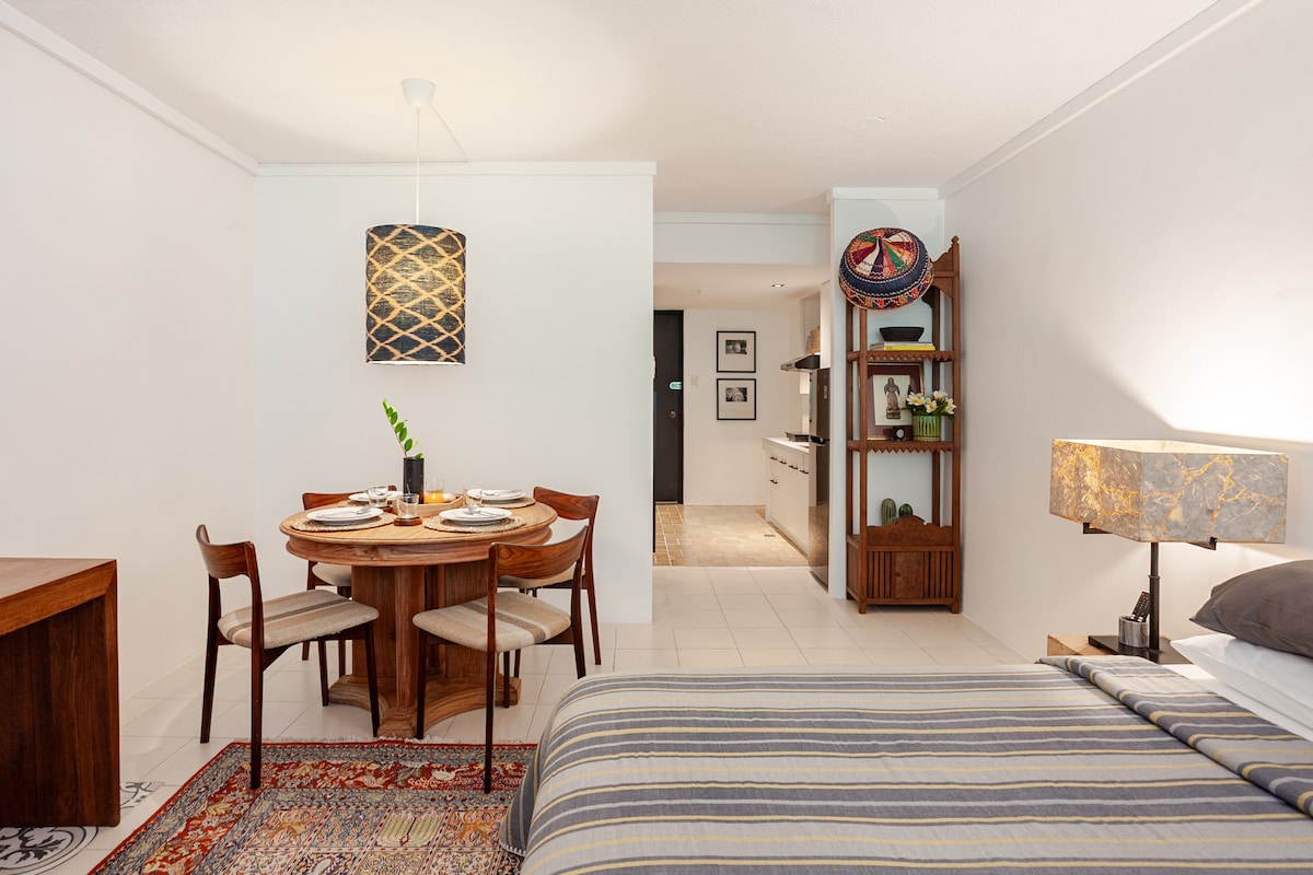 Perfectly situated in the heart of the Poblacion, Makati Restaurant and Entertainment District, our unit is located on the 5th floor of a boutique condo building w/ 24 hour security. Our 1br boasts views, a 50s mid-century modern interior and amenities including a 55" tv, Netflix, 300 Mbps, w full kitchen. Walk to nearby bars, casual restaurants, and fine dining. Experience art and culture! The perfect destination for couples, solo adventurers, a business traveler, short trips, and vacation!