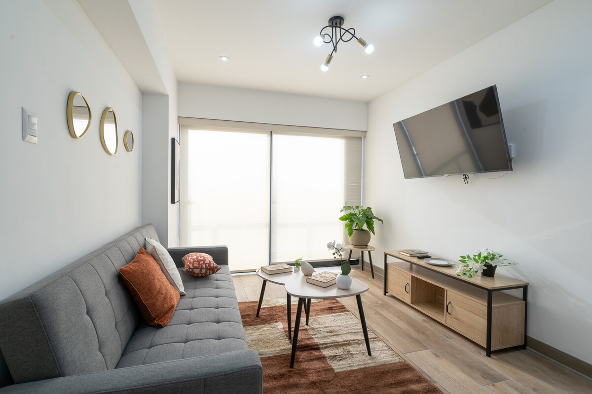 Departamento amplio y elegante en el corazón de Barranco. Ubicación privilegiada: A pasos de los principales puntos turísticos de Barranco y Miraflores, de los mejores restaurantes, bares y galerías de arte. Dormitorio principal: Cama king-size y gran walking closet. Espacio abierto y luminoso: Sala de estar y kitchenette con luz natural. Cochera privada: sujeta a disponibilidad Áreas comunes: Gimnasio, ambiente para reuniones y area de juego para niños. Estilo minimalista.