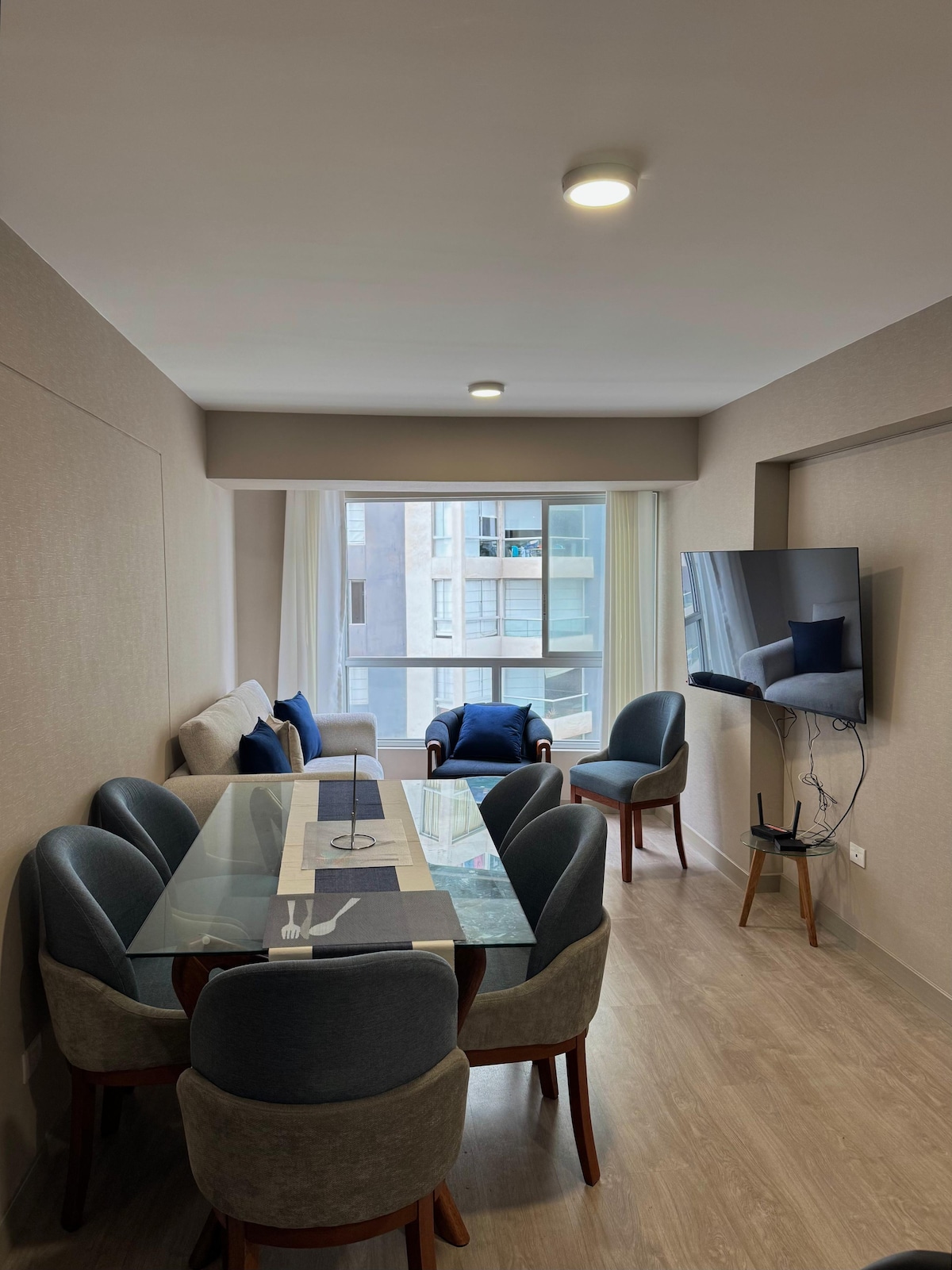 Es un apartamento cómodo, ubicado en el centro de miraflores a 1 cuadra del malecón, muy cerca a restaurantes, centros comerciales (larcomar), lugares turísticos, playas, entre otros. De 90 m2 de amplitud con 1 cama, 1 baño completo y 1 medio baño, 1 cocina, sala y comedor. El apartamento está en un sexto piso con ascensor. Un lugar muy acogedor y en uno de los distritos más importantes de Lima.