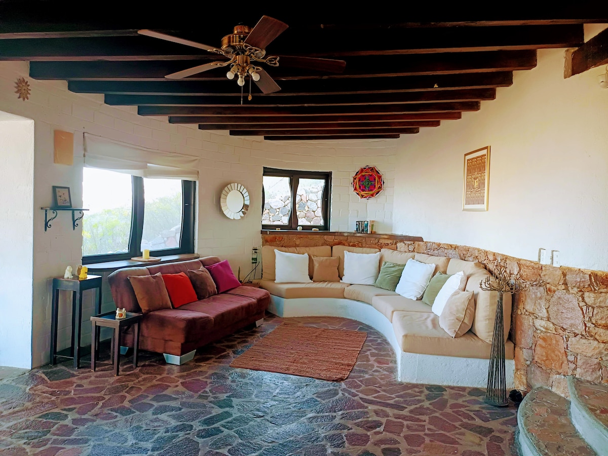 Casita estilo mexicano , ideal para familias y parejas (NO GRUPOS DE JÓVENES )ubicada en la parte posterior de la peña de Bernal, un lugar encantador para descansar y disfrutar de la tranquilidad en medio de paisajes del campo ,cuenta con sala con medio baño, chimenea , 2 recamaras ambas con baño completo , cocina totalmente equipada . Terrazas con vista a la peña , con muebles de jardín y área de fogata . Contamos con servicio de masaje ( Previa reservación ), solicita información