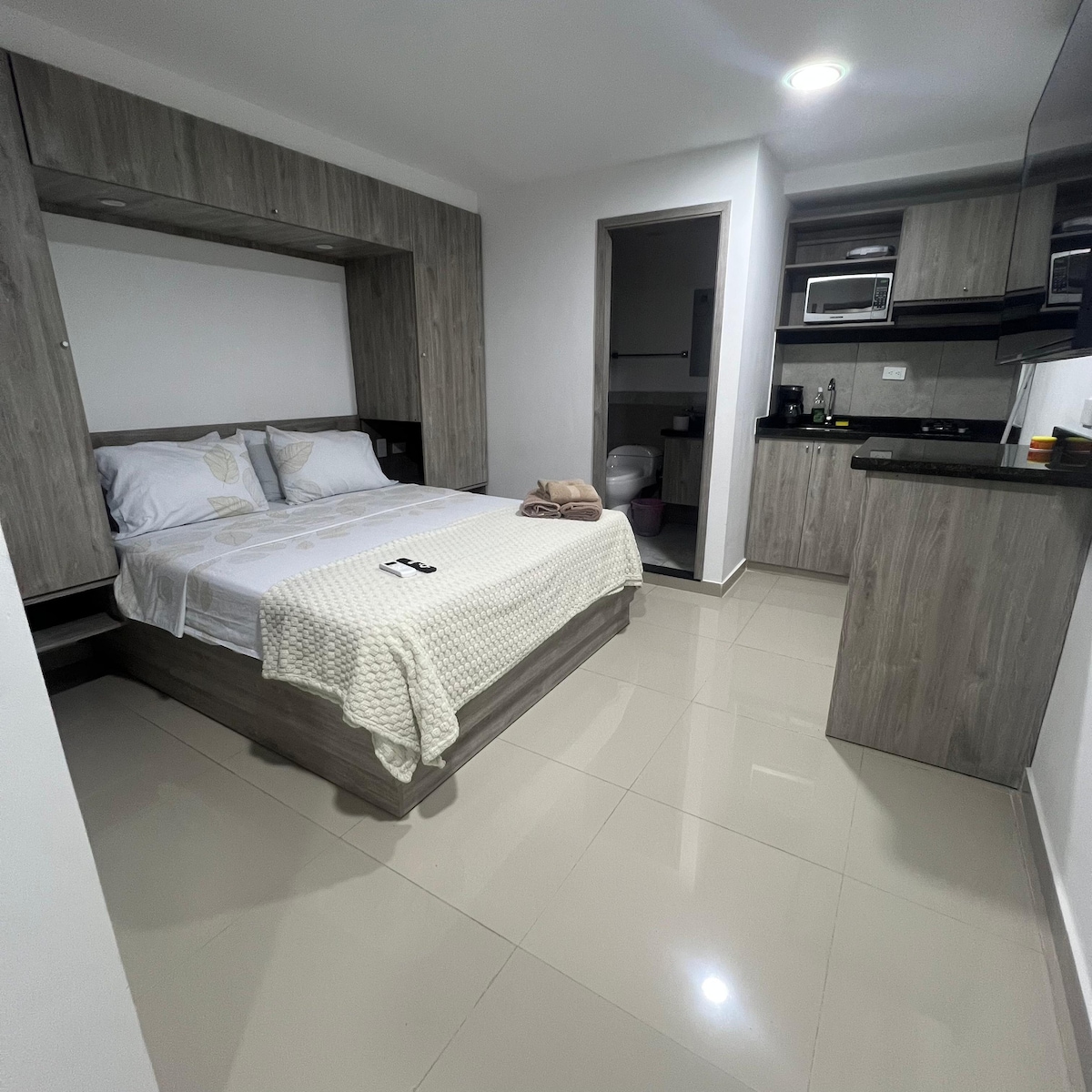 EXSTR APARTAMENTO ERE CENTENARIO 202 🌴 Alójate con comodidad y estilo en este elegante estudio en el segundo piso, idealmente ubicado en el peatonal Centenario, a pocos pasos de la cultura, la gastronomía y la vida nocturna de Bulevar del Río, Granada y El Peñón. Con una cama tamaño king europea, aire acondicionado, SmartTV, agua caliente ilimitada y una cocina totalmente equipada. Internet de fibra óptica dedicado (más del 99 % de tiempo de actividad) hace que este sea un hallazgo raro en Cali, perfecto para nómadas digitales, ejecutivos, viajeros solitarios y parejas que buscan una estancia premium.