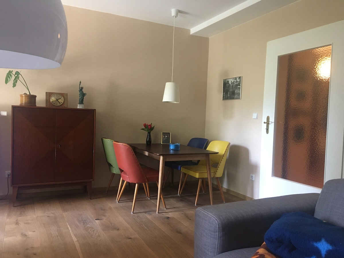 El apartamento está situado en la planta baja del edificio del patio. Hay un salón-dormitorio, una cocina-comedor y un baño con ducha. También incluye una acogedora zona al aire libre. Usted vive en una casa holandesa en el Holl. Viertel. Ubicación en el centro de la ciudad a 1 minuto a pie del tranvía. Se puede llegar a la estación central en 4 paradas. Casi todos los lugares de interés, comida, bebida, compras están a poca distancia a pie.