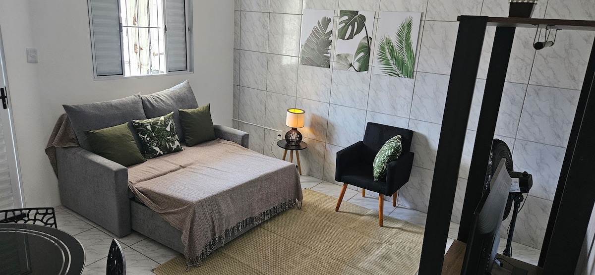 Somos um casal que amamos deixar espaços aconchegantes e perfeitos para ser uma hospedagem prática e com estilo. Além da ótima localização com mercado e farmácia super próximo. ⚠️Sem vaga de garagem⚠️ Apto com um quarto super aconchegante com ar condicionado, banheiro, sala com cozinha(geladeira, fogão com forno, microondas e utensílios para cozinhar) espaço office com escrivaninha e cadeira. Apto super arejado e muito bem iluminado. TV smart na sala, internet de 300mb com Wi-Fi.