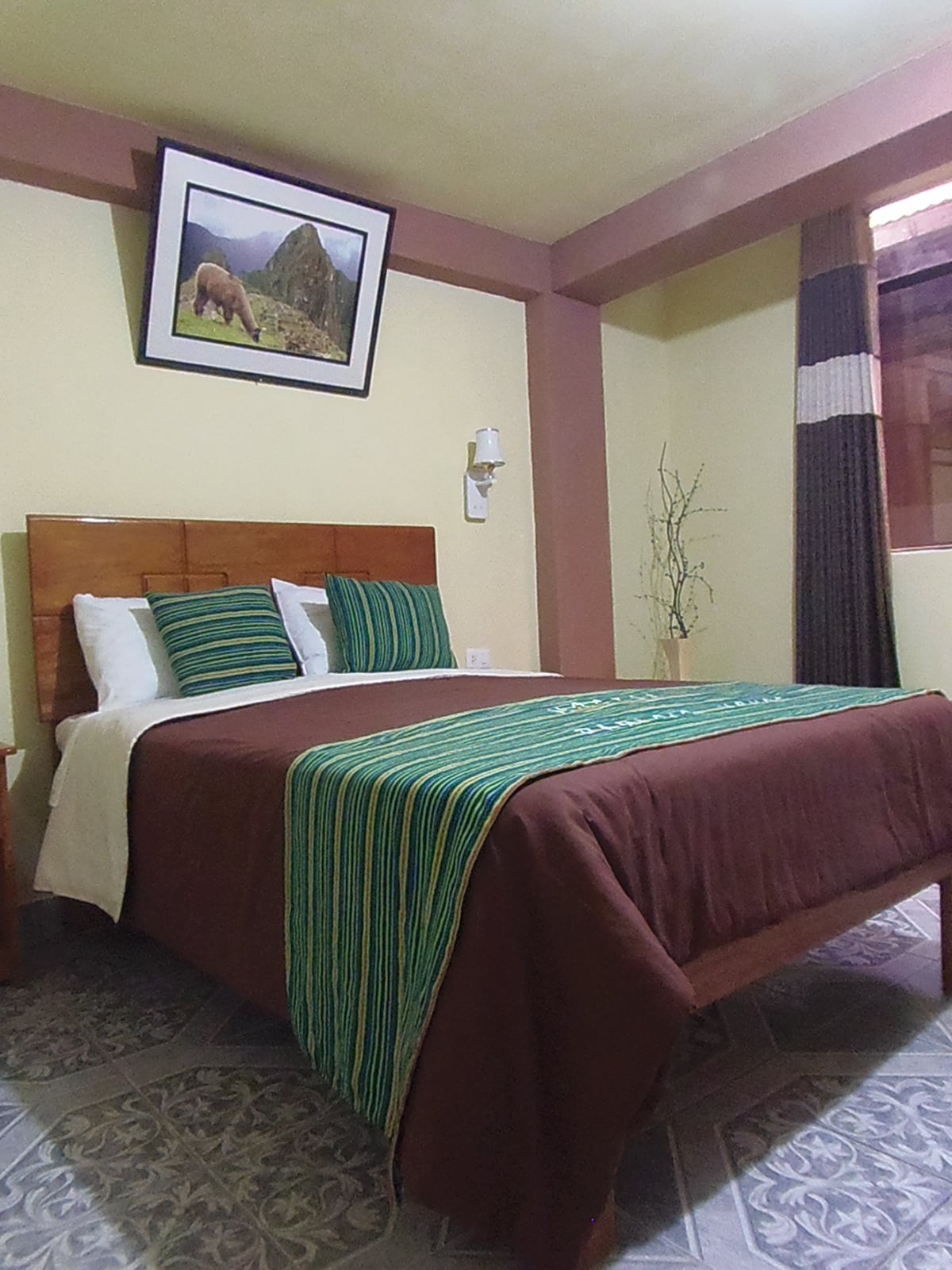 La habitación, TIENE UNA CAMA DE DOS PLAZAS, y una cama individual, servicios higiénicos dentro de la habitación. Implementos de limpieza personal: 3 toallas, un rollo de papel, dos jaboncillos, dos cojines de champú. (dependiendo de la cantidad de huéspedes) Tiene un velador, un colgador de pared, una mesa (70 cm X 70 cm) CON DOS sillas, UN felpudo. TIENE de un florero con una copia de las flores oriundas de la zona, dos cuadros hechos por artistas cusqueños.