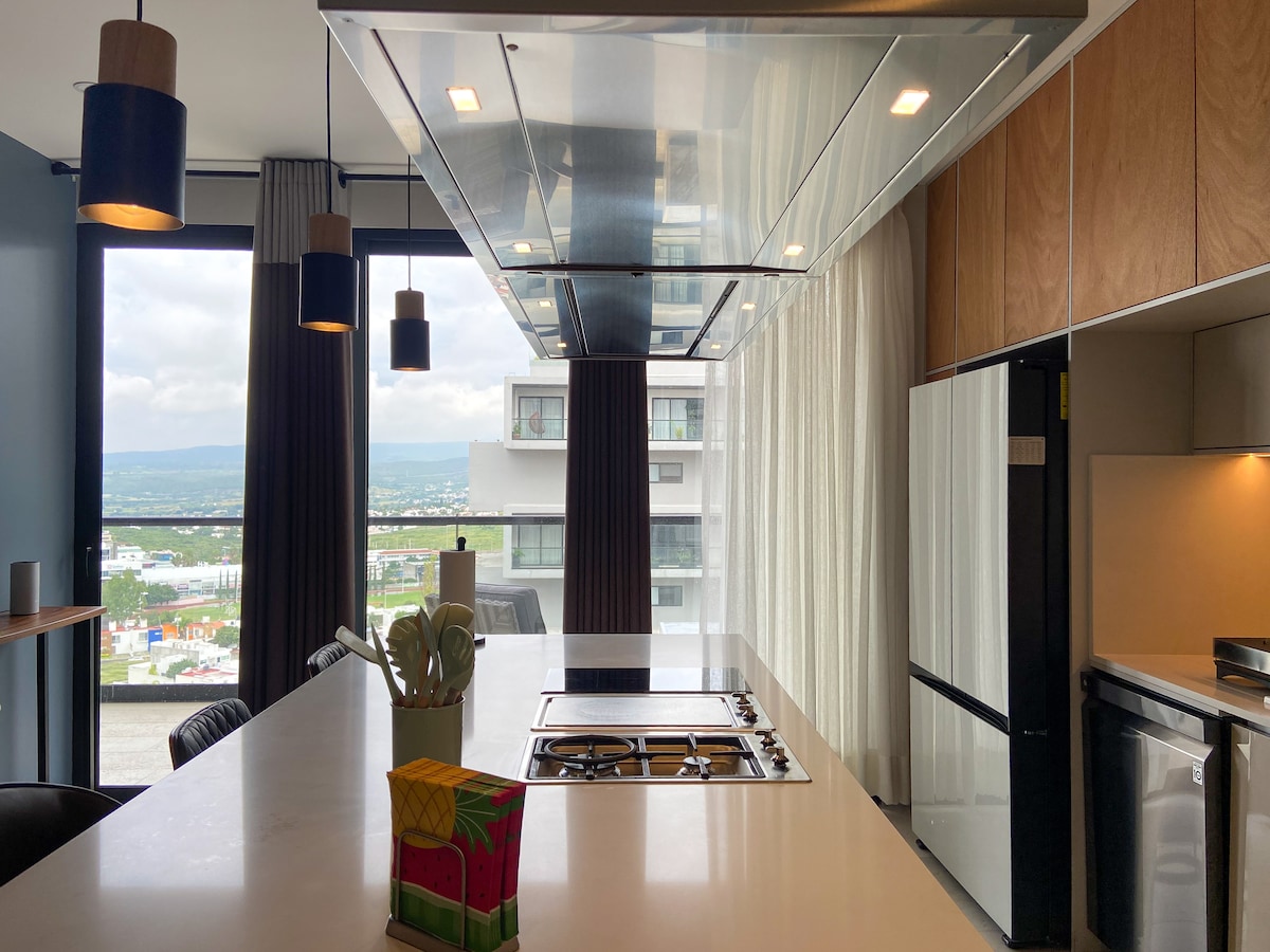 Amplio departamento nuevo de 160 m2, ubicado en el corazón de Juriquilla ofrece una experiencia única, con increible tecnologia, iluminacion, amenidades y entretenimiento. Si busca lo mejor, no busque más y venga al departamento más moderno y lujoso de Querétaro para una estancia inolvidable Caminando del Starbucks, Walmart, bares y los mejores restaurantes como Sonora Grill & Hunger, este departamento lo tiene todo, camas cómodas, amplio balcón, TVs 4K OLED y Home-Cinema de 100" desde su cama