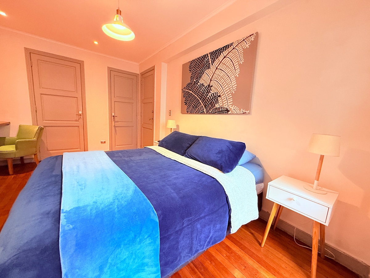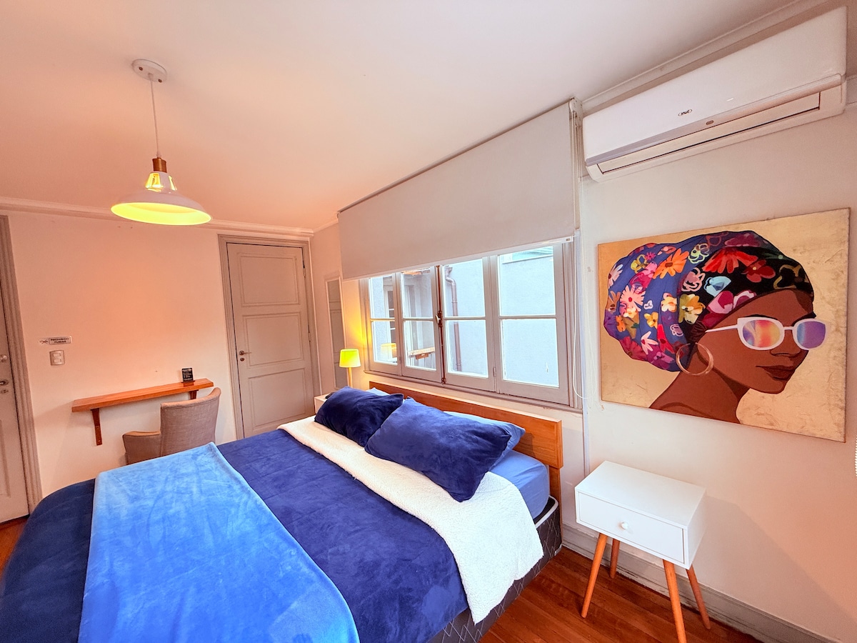 Habitación hermosa con cama queen size, cómoda, colgador de ropa, una mesa con dos sillas. Habitación amplia y luminosa en el corazón de Valparaíso. Cuenta con un baño privado afuera de la habitación y cocina compartida. Ven a disfrutar de este tranquilo y céntrico alojamiento. Ubicados en el centro del barrio histórico, en pleno cerro Concepción. Acceso directo a rutas patrimoniales, restaurantes y bares destacados de la ciudad. Instalaciones cómodas y seguras.