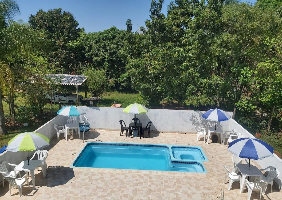 El sitio está en el camino de la fe. Ofrece descanso, naturaleza, aire fresco, un entorno para que socialices con amigos y familiares. ayuntamiento - Máximo 15 personas ( 11 para dormir) - Zona de barbacoa con congelador - Piscina grande - 4 dormitorios (1 con baño privado) - 2 baños en el área de la piscina - 2 baños dentro de la casa. - balcón con soporte de red - Cocina interior ( con microondas, nevera, 2 congelador y estufa) - sala de juegos distrito ⚠️ de fiestas con boletería, baladas y raves.