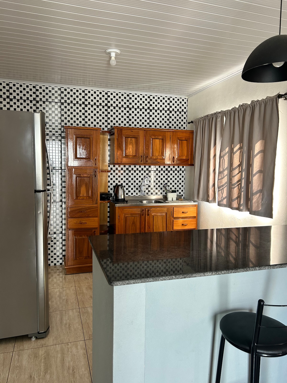 Casa de dos dormitorios y sala de estar con sofá cama. Dormitorio 1: dos camas dobles y una individual; Dormitorio 2: una cama doble y una litera individual. Dormitorio 3: sofá cama y ventilador portátil. Sala de estar con sofá, TV de 32 pulgadas y wifi. Ambas habitaciones (1 y 2) tienen aire acondicionado. Cocina completa, con utensilios básicos de cocina (platos, cubiertos, ollas y sartenes), mesa y sillas, nevera, estufa con horno, microondas y hervidor eléctrico.