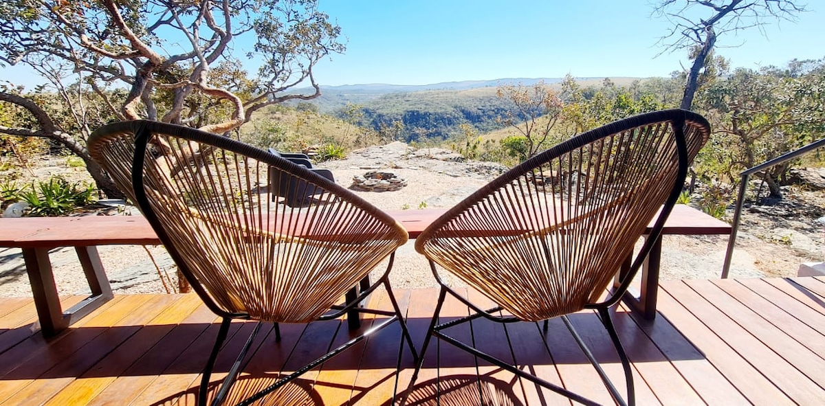 Nuestro chalet está totalmente integrado en la naturaleza. Tiene grandes marcos de vidrio y la búsqueda gratuita de Cerrado y las montañas que ofrecen una vista espectacular. Cocina completa, ropa de cama y baño de primera categoría, gran ducha climatizada, vestidor y cama con colchón de hotel de 5 estrellas. Hay un balcón con una terraza a lo largo de toda la longitud del chalet ,con mesa y sillas en el exterior para que los huéspedes puedan contemplar la naturaleza y el cielo estrellado de Chapada - tomar un vino, por supuesto. =)