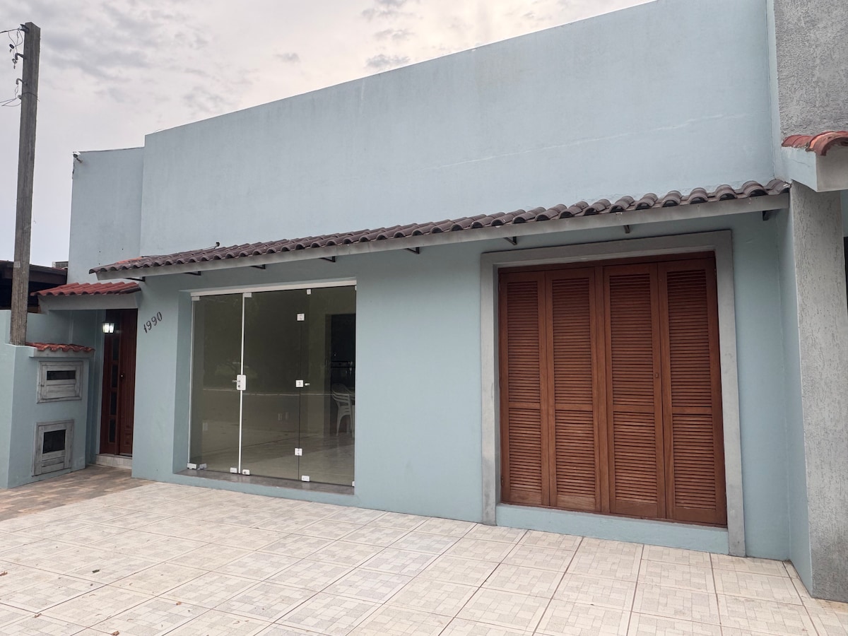 Casa de esquina, amplo espaço interno, dois quartos com ar condicionado(uma suíte) banheiro social com chuveiro, lareira, espaço da churrasqueira fechado, garagem, pátio, wi-fi, cozinha, tudo isso a uma quadra da praia.