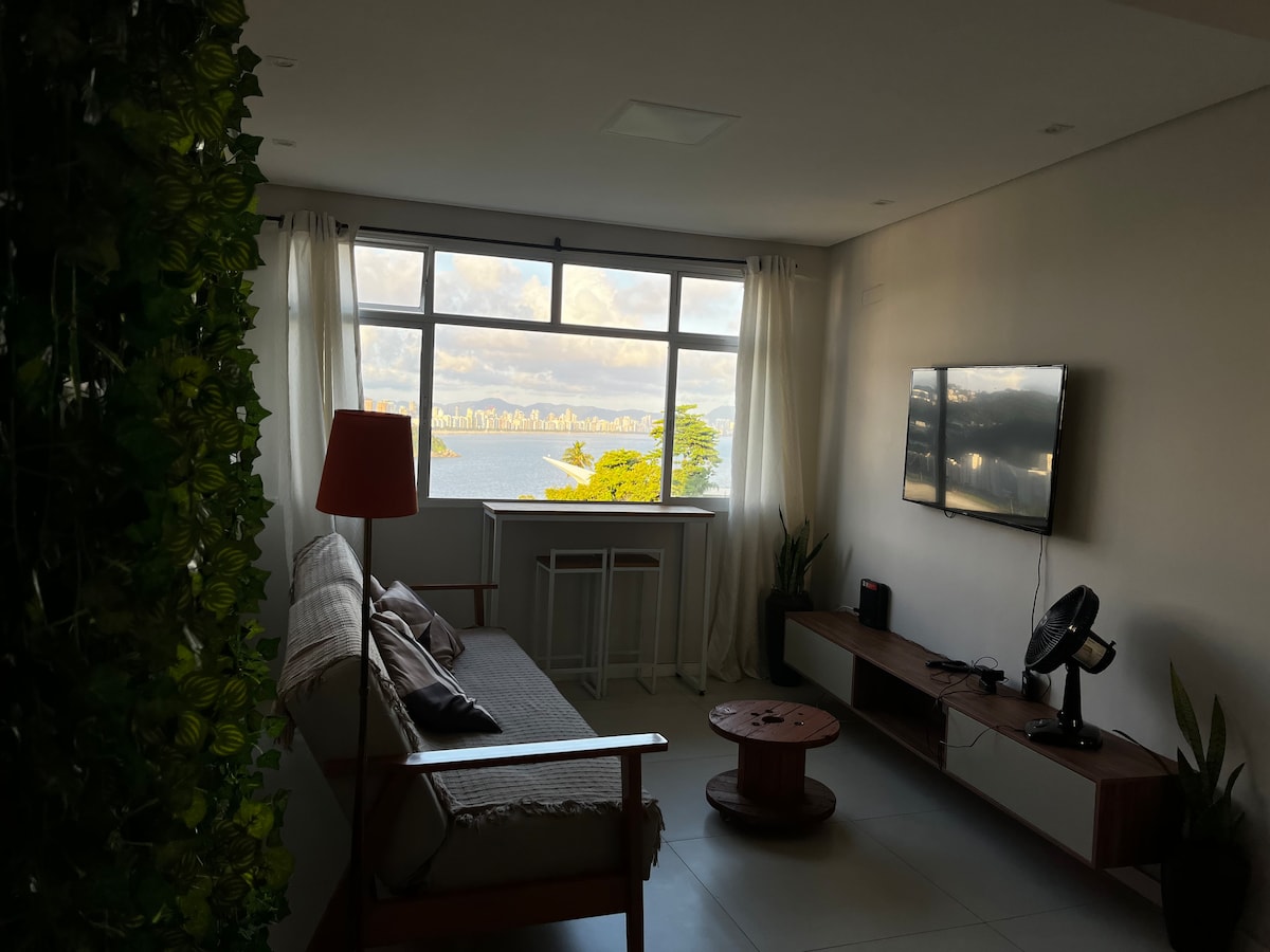 Venha sentir a experiência de se hospedar sobre o mar, com uma vista incrível, num apartamento aconchegante, confortável, limpo, seguro e completo, com tudo o que você precisa para relaxar e ficar apreciando a vista da janela. Localizado no topo da Ilha Porchat, em SV. Apto com ar condicionado, cama box casal, sofá cama, Smart TV com acesso ao Netflix, internet de alta velocidade, cozinha completa com todos os utensílios necessários para preparar refeições, e curtir a paz e tranquilidade.