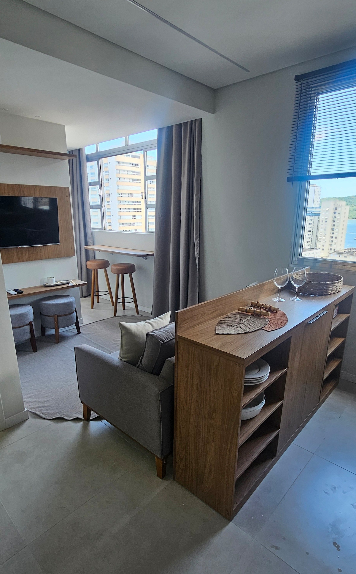 Lindo studio com vista MAGNÍFICA para oceano ,embarcações (navios, lanchas, veleiros, jetski, stand up); ponte pênsil e um pôr do sol incrível. Localizado próximo ao restaurante e choperia "Terraço" com uma gastronomia fantástica, vista panorâmica da baixada santista, música ao vivo e ambiente aconchegante. Nas proximidades temos passeios de barcos, morro da Asa Delta, Shoppings , emissário, teleférico, visita ao aquário de Santos, passeio turístico de bonde, praça das bandeiras, ciclovia e paz