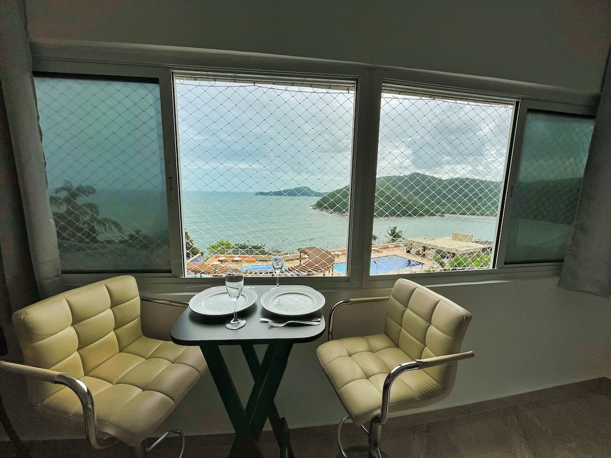 Viva momentos inesquecíveis neste lugar único e ideal para casal c ou sem filhos. Melhor vista do litoral de São Paulo. Stúdio de 34m², localizado no alto da Ilha Porchat, com vista para o mar. Cozinha completa para não precisar gastar fora. - Wi-Fi. - Self check-in. - Ar condicionado split de 24000 Btus. - Lençóis e toalhas - Cobertor. - Garagem na propriedade. - 1 cama. - Tomadas 220V - Secador de cabelos. - Fogão 4 bocas - Airfryer - Micro-ondas. - MERCADINHO NO CONDOMÍNIO.
