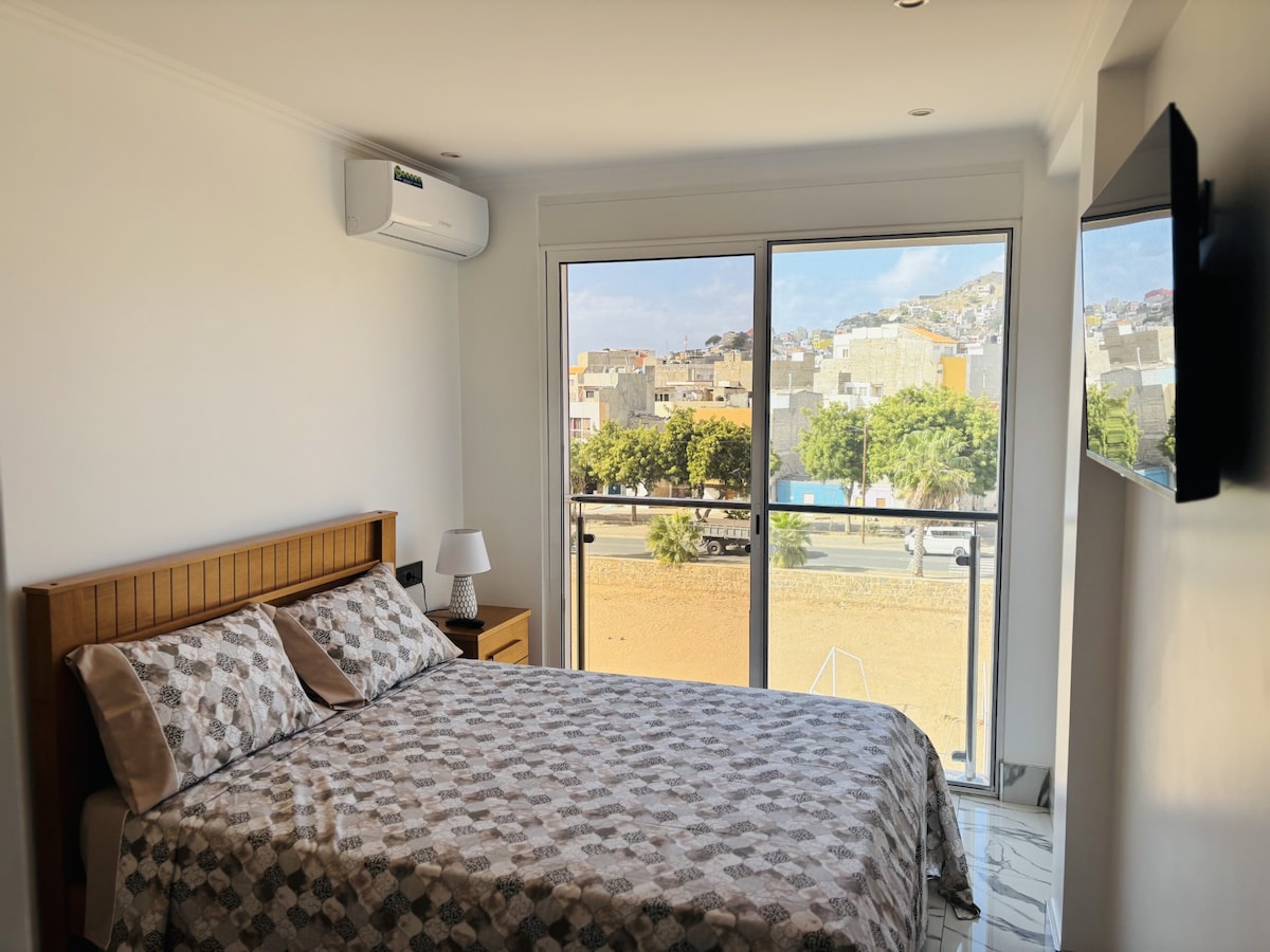 Disfruta de una experiencia acogedora y moderna en este céntrico alojamiento. El apartamento está en el segundo piso y ofrece una bonita vista de la ciudad de Mindelo, Monte Cara (la cara de la montaña) y la isla vecina de Santo Antão. A tres minutos llegas a Praça Nova (una plaza central) y a 10 minutos a la playa de Laginha.