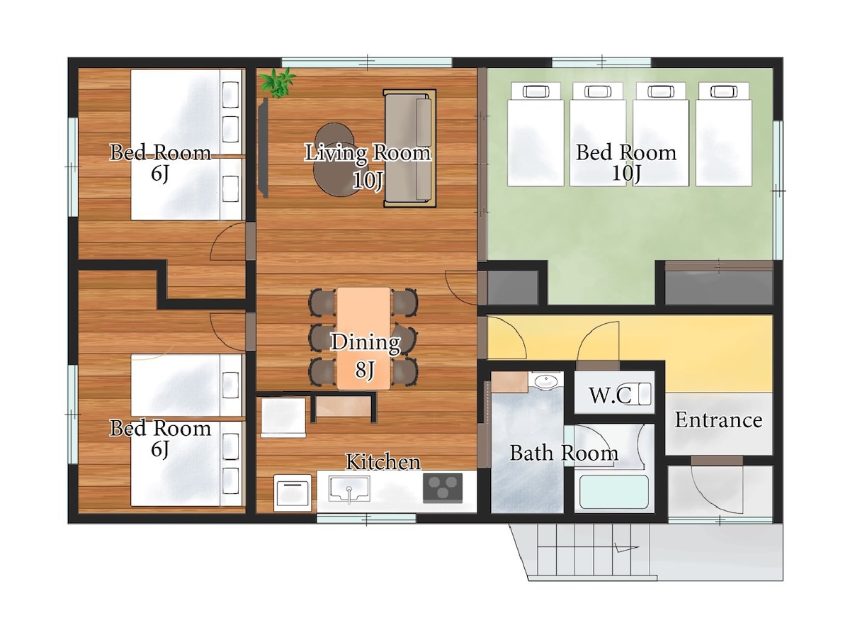 Completamente independiente en una casa de 2 familias. Todo el 2LDK independiente en la planta baja es un alojamiento entero.2 dormitorios.Puede alojar hasta 4 huéspedes.Hay estacionamiento gratuito para dos autos, y el jardín es para uso exclusivo de los huéspedes.En invierno, también puedes disfrutar jugando en la nieve. El barrio es un barrio residencial tranquilo. A 5 minutos a pie de la fuente termal natural y de la piscina climatizada.También hay caminos bordeados de árboles a lo largo del río y paseos rodeados de árboles. Todas las habitaciones tienen calefacción por suelo radiante, por lo que podrá mantenerse abrigado las 24 horas del día. Además, todas las habitaciones cuentan con aire acondicionado en todas las áreas, para que puedas disfrutar de una estancia fresca y cómoda en verano. Hay estacionamiento disponible junto al edificio y frente a la entrada.