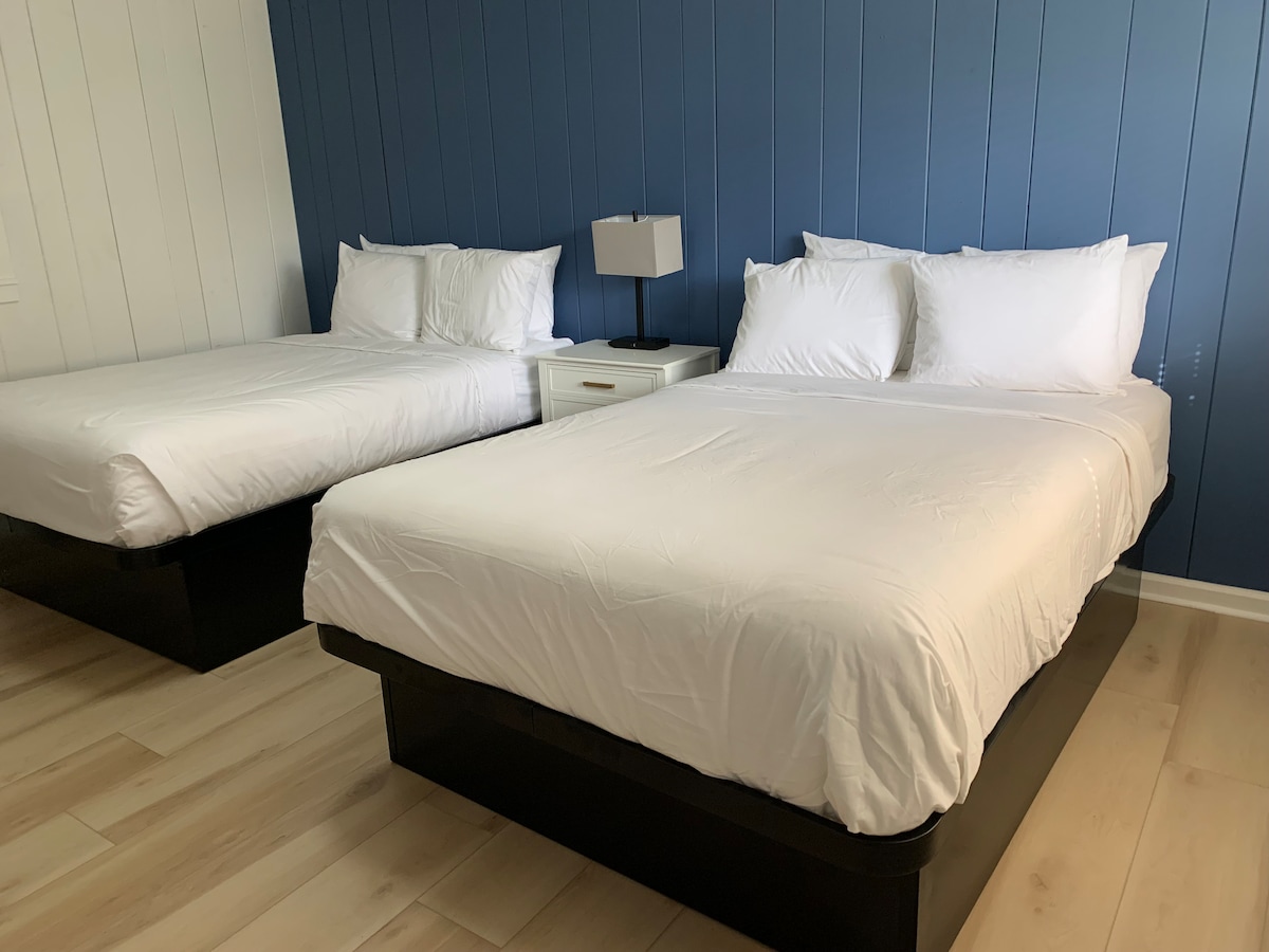 La habitación estándar de dos camas completas para no fumadores en la ubicación junto al lago tiene capacidad para un máximo de 4 huéspedes. Los huéspedes disfrutan de ropa de cama nueva y fresca, TV de pantalla plana de 50 pulgadas, wifi gratuito y aire acondicionado con control de temperatura. Todas las habitaciones incluyen cafetera, microondas, mininevera y baño privado con ducha y bañera.