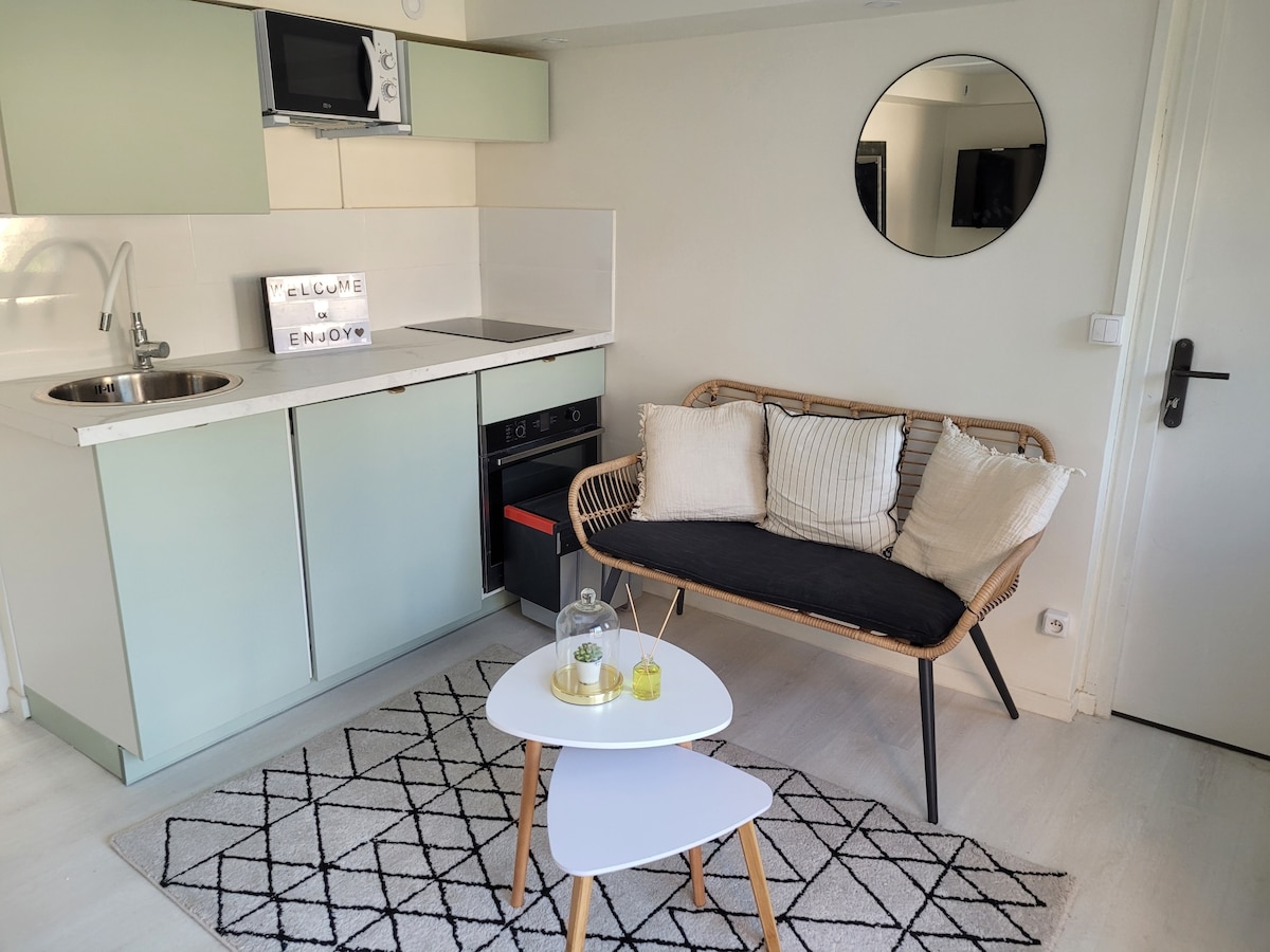 🏠Agradable estudio de 15 m2 independiente renovado en 2021 en una Villa en Chatou. Entorno tranquilo y arbolado. Cerca de las estaciones de autobús. 👨🍳Cocina equipada y microondas. Espacio de trabajo con escritorio plegable. Sofá cama de 3 plazas nuevo de la marca de decoración Miliboo (colchón de alta densidad) 🛀Baño y aseo privados. 💻Wifi de muy alta velocidad incluido