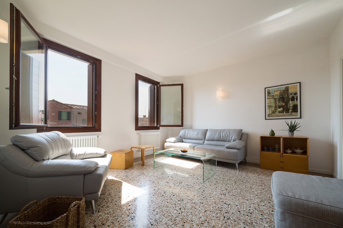 A marvellous ‘mansarda’ apartment with a wonderful ‘altana’ rooftop terrace offering exceptional views in the heart of Castello. Moments on foot to the landmark leaning bell-tower of San Giorgio Dei Greci and to the 'Questura' office of Donna Leon's fictional crime-busting Commissario Guido Brunetti on the ‘Rio di San Lorenzo’ canal, Ca’ Del Pittore offers captivating and highly individual roof-space surroundings for up to four guests on the very top floor.