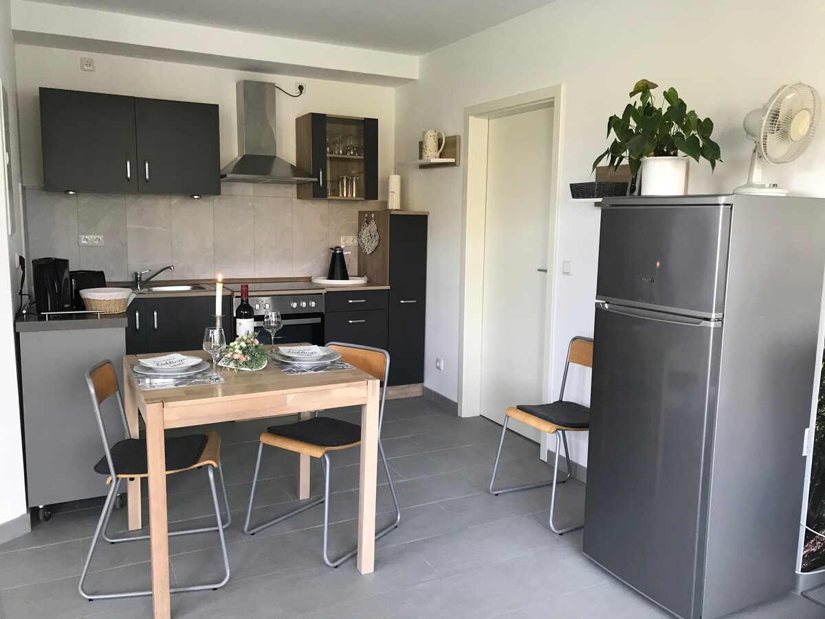 Hermoso apartamento castillo/parque de spa, sala de estar con sofá y comedor, cocina con nevera, inducción y microondas/ parrilla, hervidor de agua, tostadora, olla de prensa francesa y café en polvo. Dormitorio con sombra opaca, cama doble de 1,80 x 2,00 m, baño con ventana/bañera/ducha, balcón con asientos/almohadillas y toldo. El departamento es adecuado para 2 adultos. Se permite fumar solo en el balcón, no se admiten mascotas. Se proporcionan sábanas y toallas.