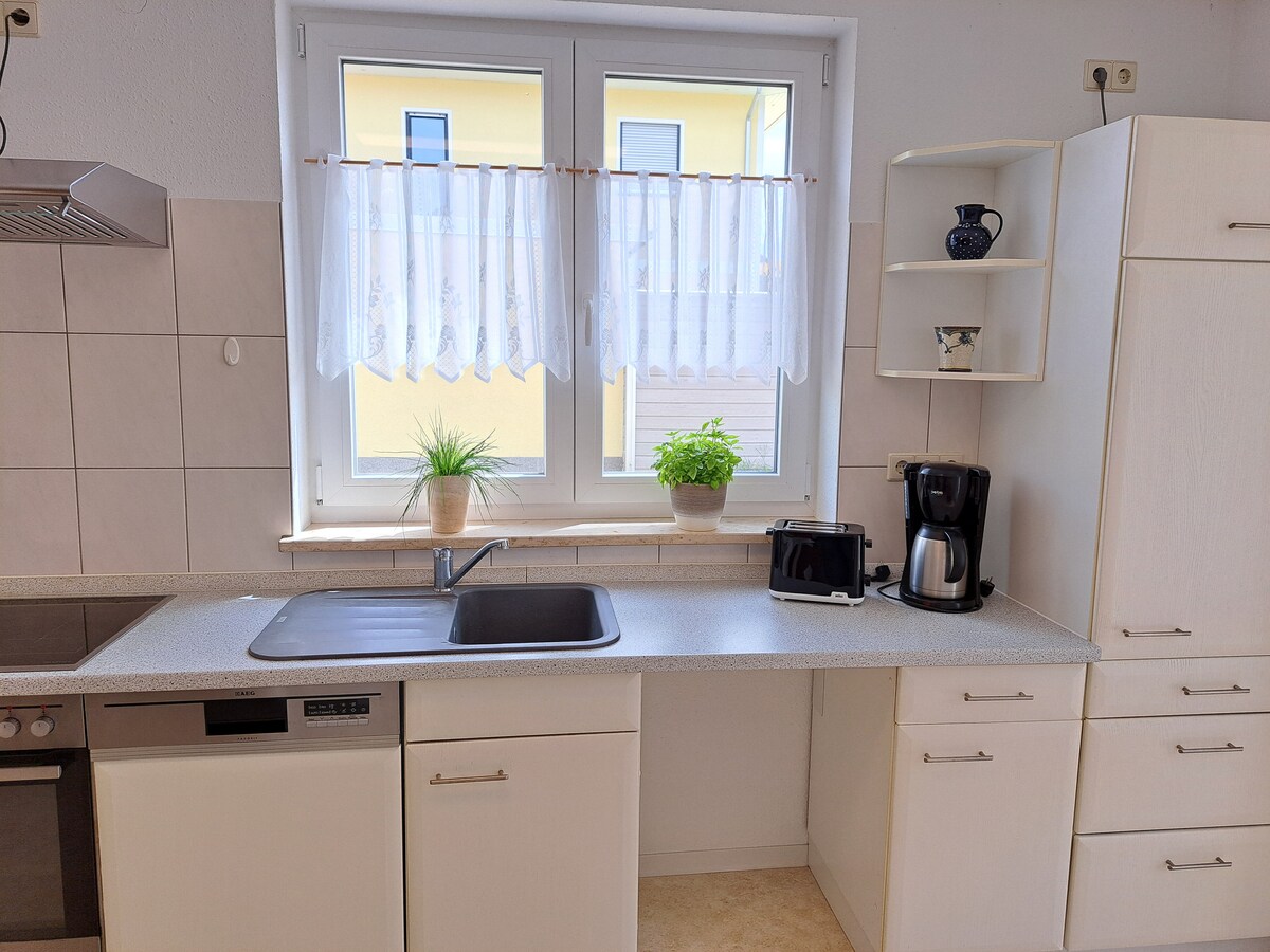 Modernizado con un baño nuevo y excelentes detalles: una cómoda cama con somier de 180 x 200 con sábanas de alta calidad y almohadas de varios tamaños le permitirán dormir a gusto. En la sala de estar, que sirve como segunda zona de descanso, te espera un sofá cama nuevo con somier (150 x 198 cm). Los muebles de hierro de estilo refinado con vidrio le dan a la sala de estar un toque elegante. Wifi rápido, TV, espacio para guardar bicicletas, balcón con vistas al campo. Adecuado para estadías largas y para empleados. El estacionamiento es gratuito en la calle.