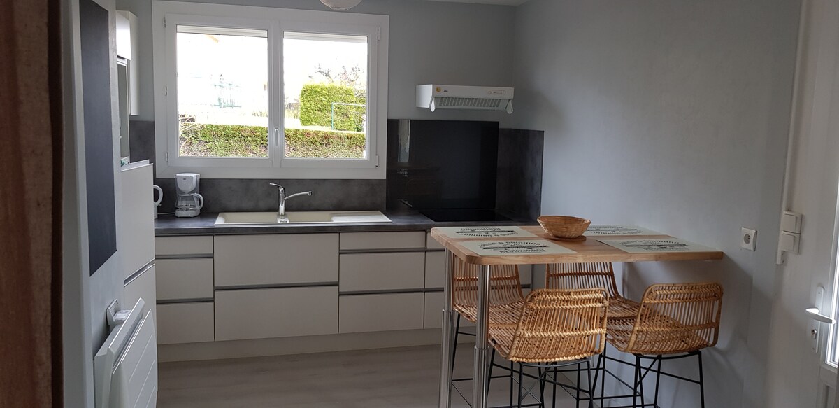 Casa nueva T2, con jardín privado y totalmente cerrado, en la tranquilidad de un callejón sin salida. Aparcamiento privado y gratuito delante del alojamiento. Equipada con muebles de jardín, tumbona, barbacoa de gas. El interior de la vivienda ofrece una sala de estar con ventanal con Smart TV, wifi, una cocina equipada, un dormitorio con cama de 160 X 200 colchón Eve viscoelástico, vestidor. Acceso a un amplio cuarto de baño, inodoro y ducha de hidromasaje. Cerca de todos los servicios y del centro de la ciudad. Bicicletas bajo petición.
