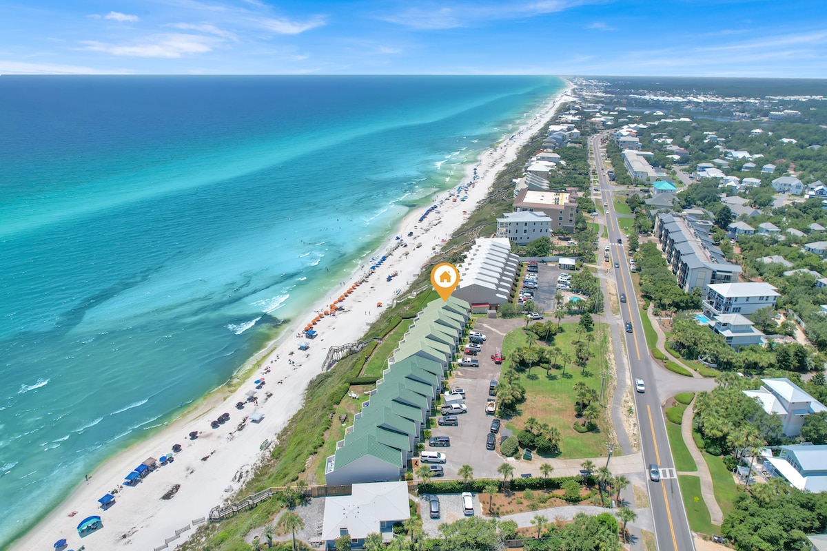 Esta ubicación PRIVILEGIADA en el lado del golfo de 30A cuenta con un acogedor condominio 1 BR con capacidad para 4 personas y ofrece impresionantes vistas al mar desde el balcón. A solo unos pasos de tu playa privada (gratuita para los huéspedes) y a pocos pasos de los mejores restaurantes de la zona, como Old Florida Fish House, Goatfeather 's y Cafe Thirty-A. ¡Esta ubicación no se puede superar! ⏤ Toallas de playa, sombrilla, sillas de playa, juguetes de arena ⏤ Directamente enfrente de Butterfly Bike Rentals ⏤ 5 minutos en auto a la costa