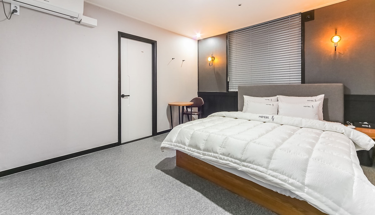 Esta habitación consta de una cama tamaño king y baño.Contamos con un ambiente agradable y un amplio estacionamiento. Hay un parque de esculturas, por lo que es ideal para pasear. Ubicado en el centro de Masan, el transporte es conveniente y es muy accesible a las principales atracciones turísticas como el Parque Marino Jinhae, el Festival de los Cerezos en Flor, el Mercado de Pescado de Masan, el campo de béisbol y las principales instalaciones comerciales como oficinas gubernamentales y empresas. Este alojamiento tiene accesibilidad y estilo.