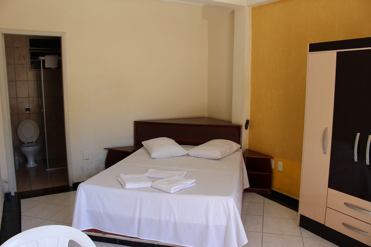 O quarto está equipado com roupa de cama e banho, WiFi e ar condicionado.