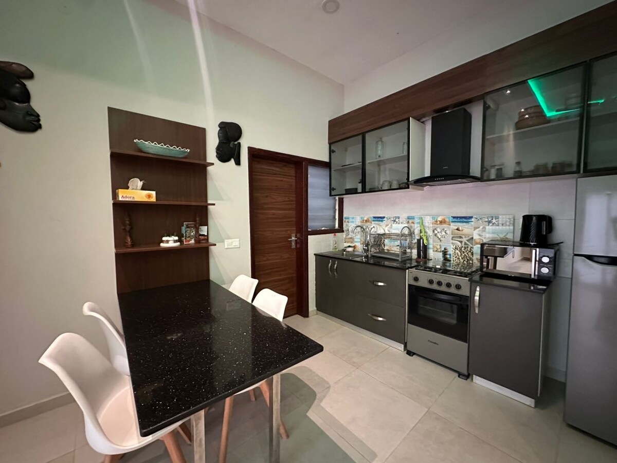 Te damos la bienvenida a "AFRIKAN-LUXE" ⭐⭐⭐⭐⭐ Un alojamiento lujoso que combina la estética afrikáner con la elegancia contemporánea; diseñado para aquellos que aprecian el arte de la vida elegante. ¡Este condominio de 3 dormitorios y 3 baños ofrece un refugio tranquilo con todo lo que necesitas para una estancia cómoda en Gambia! El espacio es céntrico para todo, ¡así que no te perderás nada! Estás a pocos minutos de playas, la franja de Senegambia, Turn Table, el aeropuerto y todos los restaurantes y vida nocturna locales que tu corazón desea.