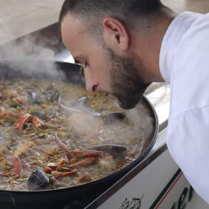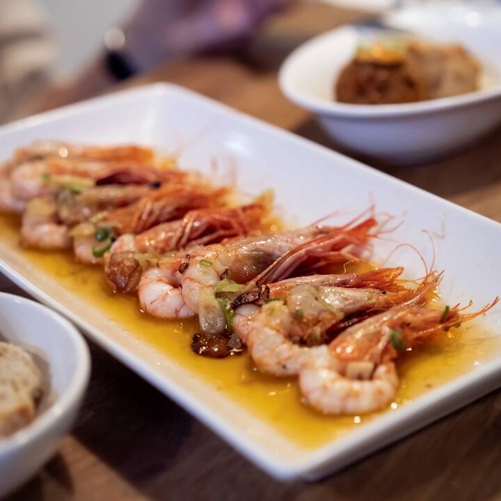 Del mercado local a tu casa. Comenzamos con 3 entrantes, celebrando los productos de la isla; langostinos al ajillo de Sóller, calamares a la bruta y anchoas marinadas. Plato principal: paella de marisco. Terminamos con un delicioso pudín de la abuela.