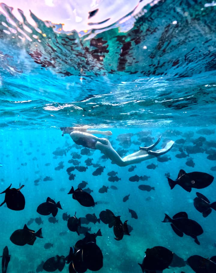 Fotografío a las personas en ángulos dinámicos con la vida marina hawaiana y los corales como telón de fondo.