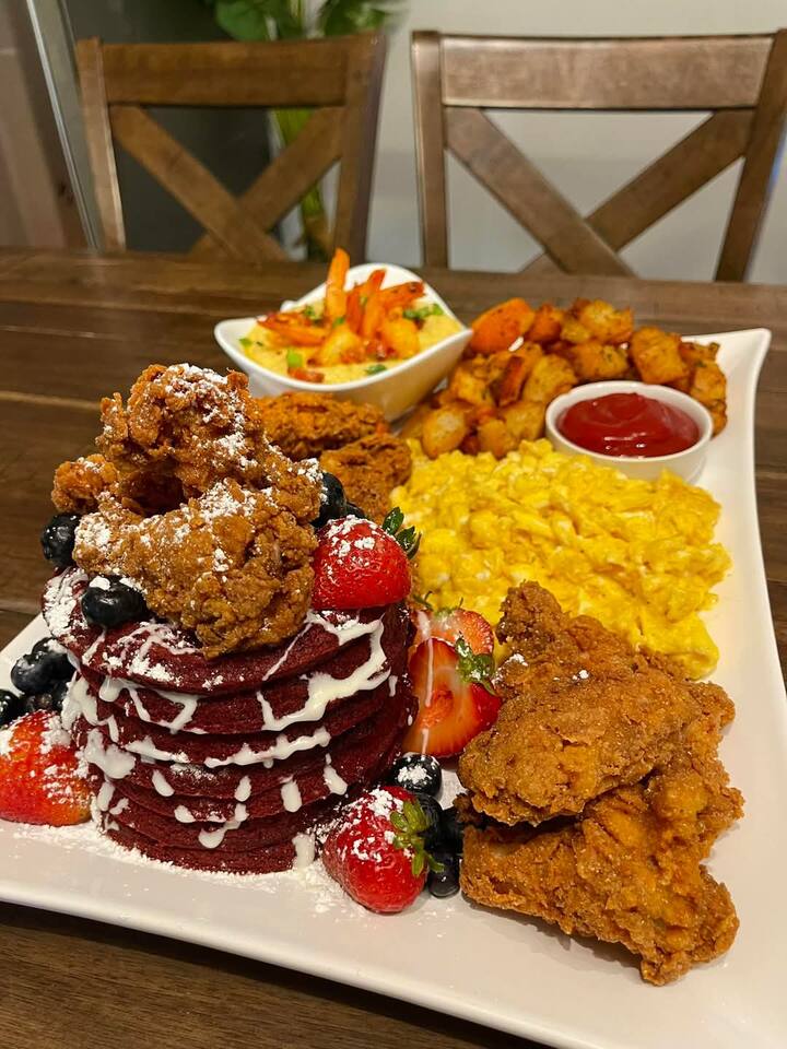 2 proteínas 2 alimentos con almidón, bandeja de frutas, pasteles Tostada de aguacate, mimosa
