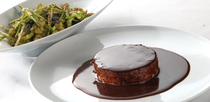 Le propongo un menú de alta gama que incluye productos de temporada excepcionales. Disfrutará de 1 bocado sorpresa, 1 entrada, 1 plato de carne y 1 plato de pescado y 1 postre. Con la posibilidad de añadir una selección de quesos curados.