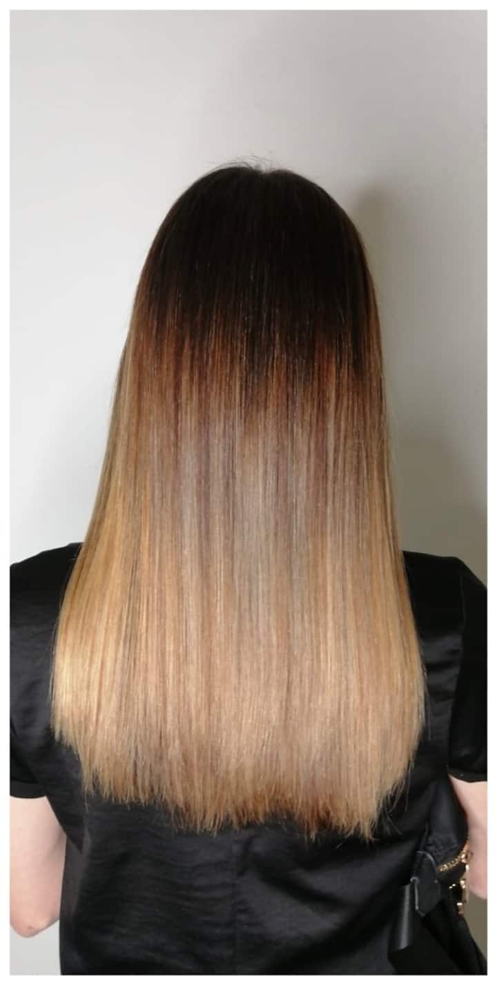 El cabello se alisa con plancha tras aplicar protector térmico y se finaliza con serum nutritivo en puntas. El resultado es un estilo sencillo y elegante, perfecto para cualquier ocasión.