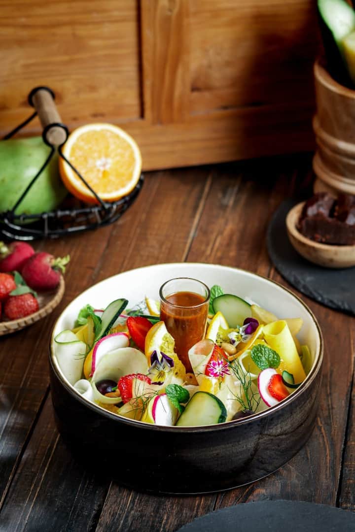 - Ensalada local de frutas jóvenes mixtas con flor de jengibre, nuez y aderezo de tamarindo con azúcar morena