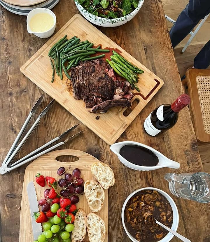 Un menú clásico de asados elevados con carnes de primera calidad como el ribeye seco, el hombro de cordero cocido a fuego lento, el pollo asado o la panceta de cerdo, servido con guarniciones tradicionales que incluyen papas crujientes, verduras de temporada, pudines de Yorkshire y salsas ricas. Los entrantes opcionales y los extras reconfortantes completan la experiencia. Perfecto para reuniones acogedoras, fiestas de estilo dominical y cenas de celebración.