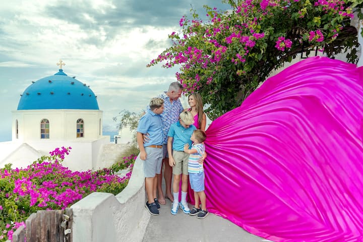 Hola visitantes de nuestra hermosa isla de Santorini, vengan conmigo a tomar una sesión de fotos conmigo bajo las famosas cúpulas azules y la vista de la caldera de este increíble cielo cicládico.