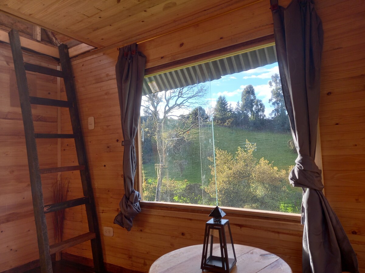 casita en la montaña,mini casa de 12mts cuadrados con vista directa al mitico cerro LAS TRES VIEJAS lugar donde transitaron los Muiscas y se desarrollo la leyenda del dorado, un espacio diseñado para desconectarte del ruido y reconectar con la naturaleza la historia y la tranquilidad absoluta,disfruta de un mirador360 con vista a las majestuosas montañas, también una minicasita al revés para la mejor foto y recuerdo de tu estadía, a tan solo una hora de Bogotá, lugar perfecto para una escapada.