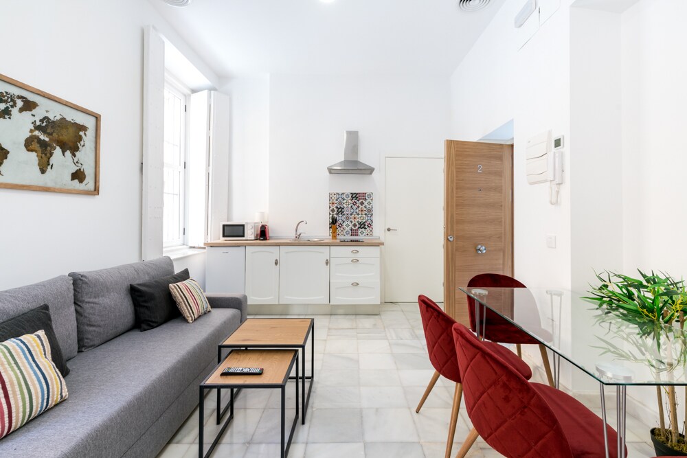 El apartamento tiene: una cocina abierta tipo americana equipada, salón comedor con sofá cama y un dormitorio con cama de matrimonio. El baño consta de ducha, secador de pelo y toallas. La capacidad del apartamento es de 3 personas. El edificio, totalmente reformado respetando su originario estilo andaluz, con ascensor y terraza comunitaria con unas vistas maravillosas de la ciudad. Licencia turística: CTC-2020100836