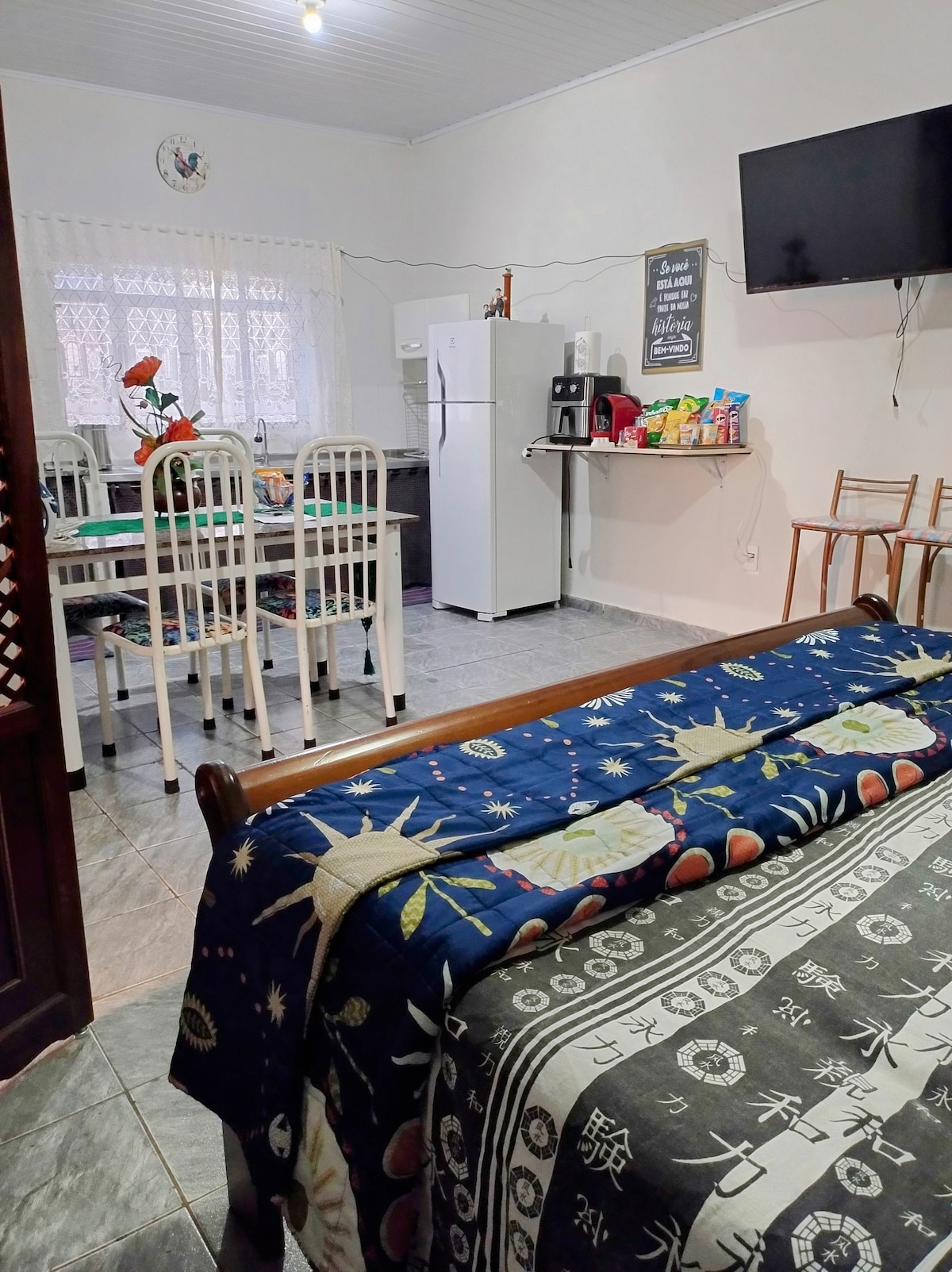 Un lugar pequeño pero agradable y limpio. Es una habitación de conexión con cocina y baño. En el dormitorio hay una cama doble y un armario,en la cocina hay una mesa con 4 sillas , refrigerador, estufa, armario y electrodomésticos. Tengo todo lo necesario para una pareja o hasta 3 personas, ¡podemos poner un colchón adicional! No es apto para estadías largas, ya que no tiene área de servicio ni patio trasero. Está en la planta baja. Si necesitas un garaje, podemos proporcionarte un lugar a unos 10 metros del lugar.
