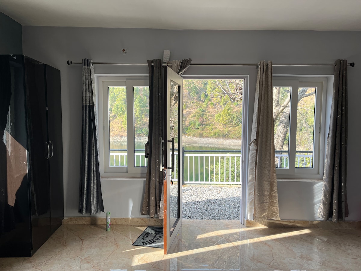 En el centro de la ciudad de Bhimtal, obtendrás 1 BHK con una vista del lago de 360 grados, que tiene una cocina, un salón (con sofá de 5 plazas con mesa + sofá cama (6x6) + espacio de trabajo) y un dormitorio (cama 6x6) con baño adjunto. Hay vistas al lago tanto desde el salón como desde el dormitorio. Puedes disfrutar de una vista de 360 grados al lago desde el balcón. Este lugar está completamente en la carretera y te hará sentir como en el cielo. Es un lugar muy tranquilo y céntrico.