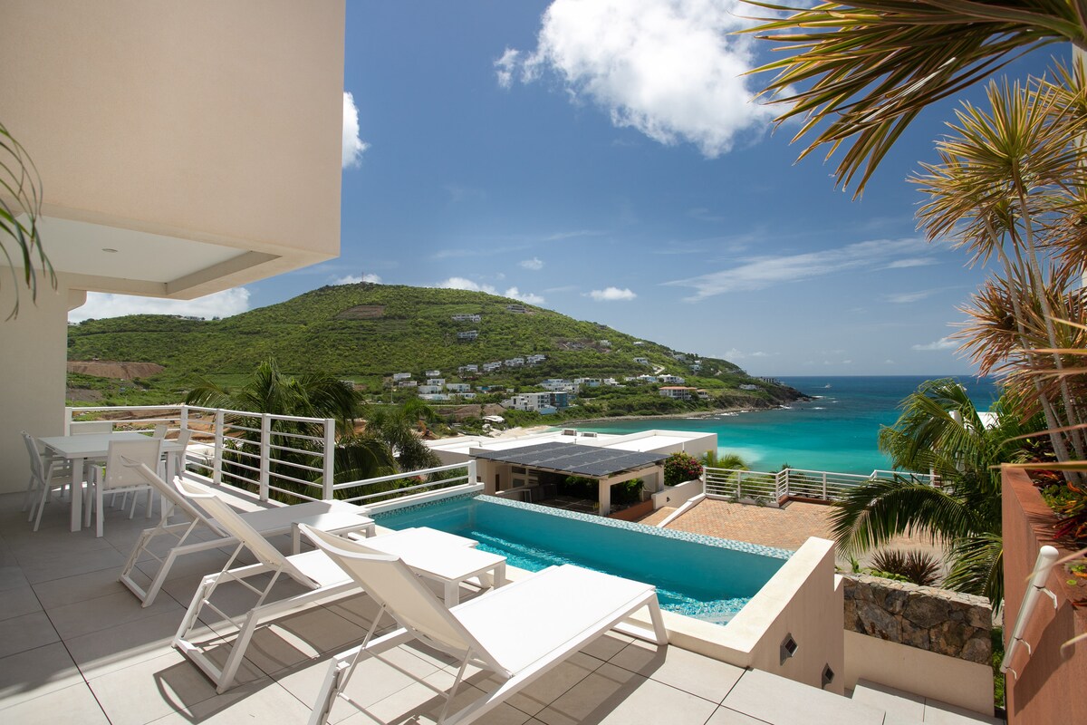 Esta lujosa villa se encuentra en una residencia segura con unas vistas impresionantes, frente al mar y la isla de San Bartolomé, encaramada en las alturas de Dawn Beach, a 15 minutos de las famosas playas/restaurantes de Orient Bay y Grand Case en la parte francesa. La villa también está a 5 minutos de la capital holandesa, Philipsburg, una visita obligada para ir de compras. Gracias a los amplios espacios exteriores y a la piscina infinita, esta villa le ofrecerá una estancia inolvidable.