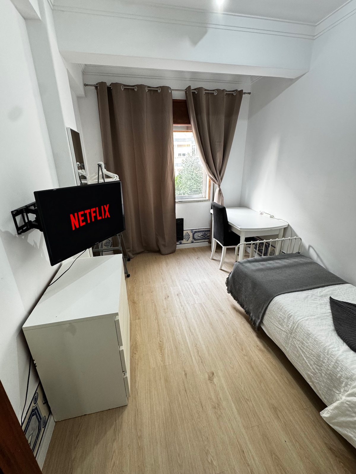 Room 5 | Step into a spacious room retreat, beautifully designed for both comfort and productivity. With a plush single bed and a dedicated workspace, it's your cozy corner in the heart of Lisbon Metropolitan Area. You'll enjoy the convenience of a shared fully-equipped kitchen, dining room, 2 shared bathrooms & complimentary Wi-Fi. Our prime location offers: - Train/metro station & bus terminal nearby - 16 min to Rossio & 12 min to Sete Rios - Supermarkets & restaurants